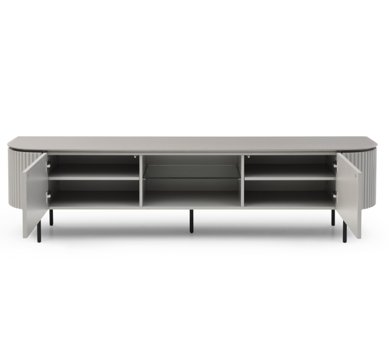 The Lantine TV Unit in light grey lacquer boasts a chic and sleek design that effortlessly complements modern interiors. Its standout feature lies in the ribbed end panels, adding a touch of texture and visual interest. The matte glass top exudes a subtle elegance while providing a sophisticated surface for your entertainment setup. Supported by black powder-coated legs, the unit maintains a contemporary edge. With one middle glass shelf and ample storage, this 2-meter-long unit offers a practical solution for organizing media equipment and accessories. The Lantine TV Unit harmoniously combines style and functionality, becoming a focal point that enhances any living space with its refined aesthetic and thoughtful design.