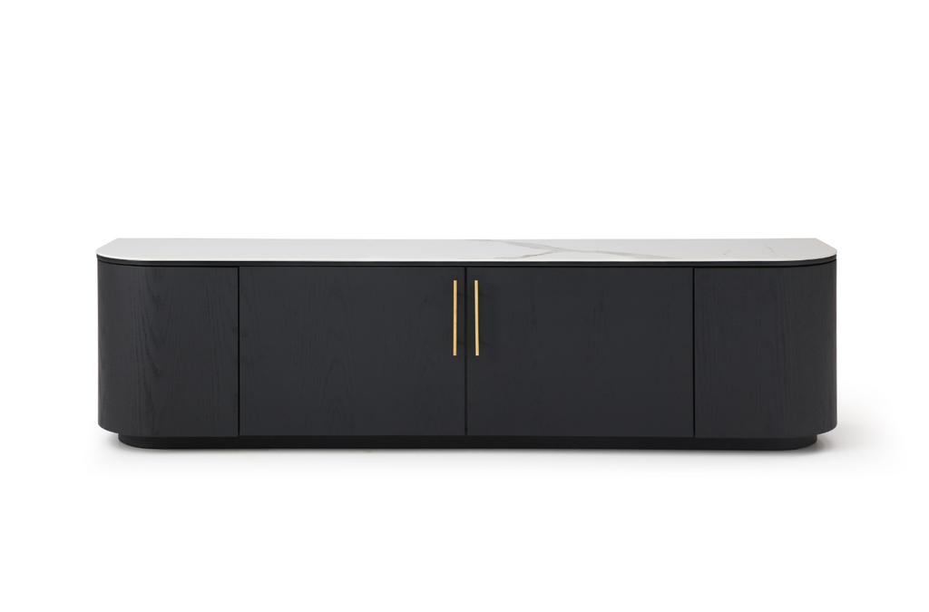 The Oakura TV Unit effortlessly combines understated elegance with functional design. Its matte black oak body exudes sophistication, providing a sleek and timeless aesthetic that seamlessly integrates into any modern living space. The unit's matte white ceramic top adds a touch of refinement, creating a striking contrast and elevating the overall sense of style. The inclusion of brass handles further enhances the unit's classiness, offering a subtle yet distinctive accent. Beyond its aesthetic appeal, the Oakura TV Unit is highly practical, featuring ample storage space to keep media essentials organized and within easy reach. With its harmonious blend of materials and thoughtful details, this unit is a tasteful addition to any home, embodying both style and functionality.