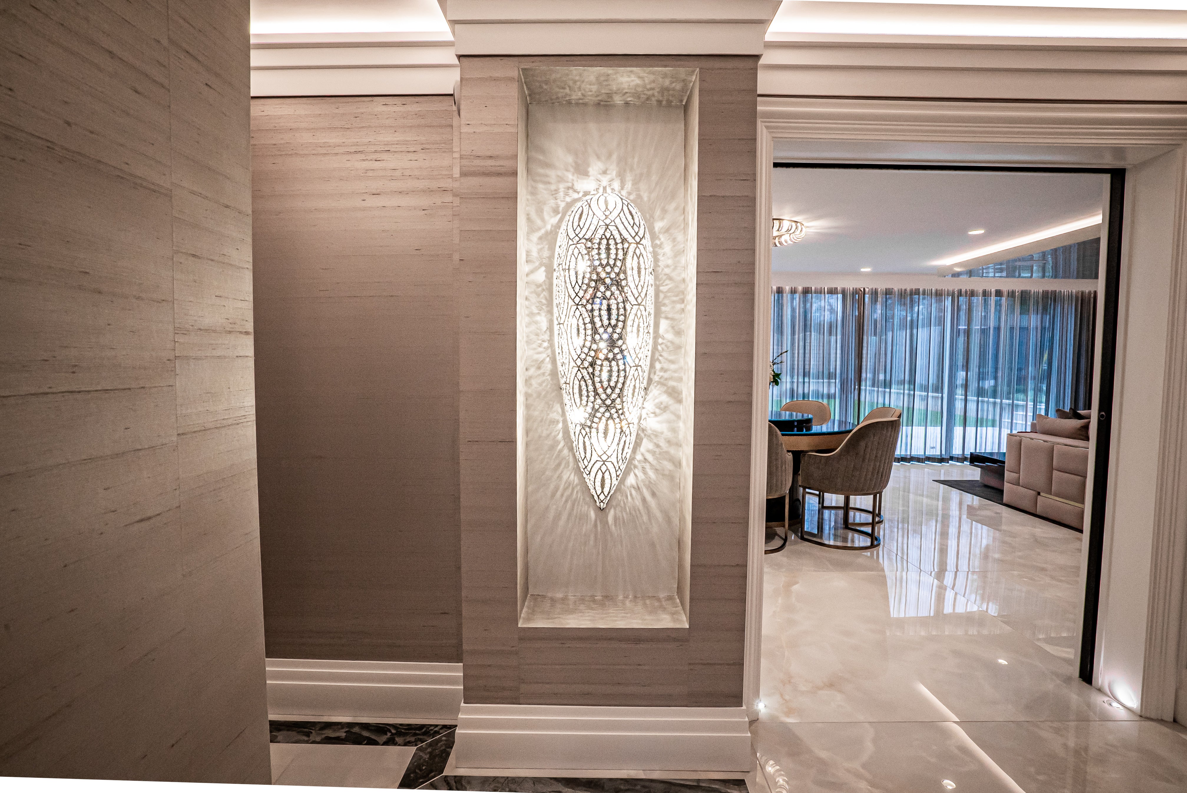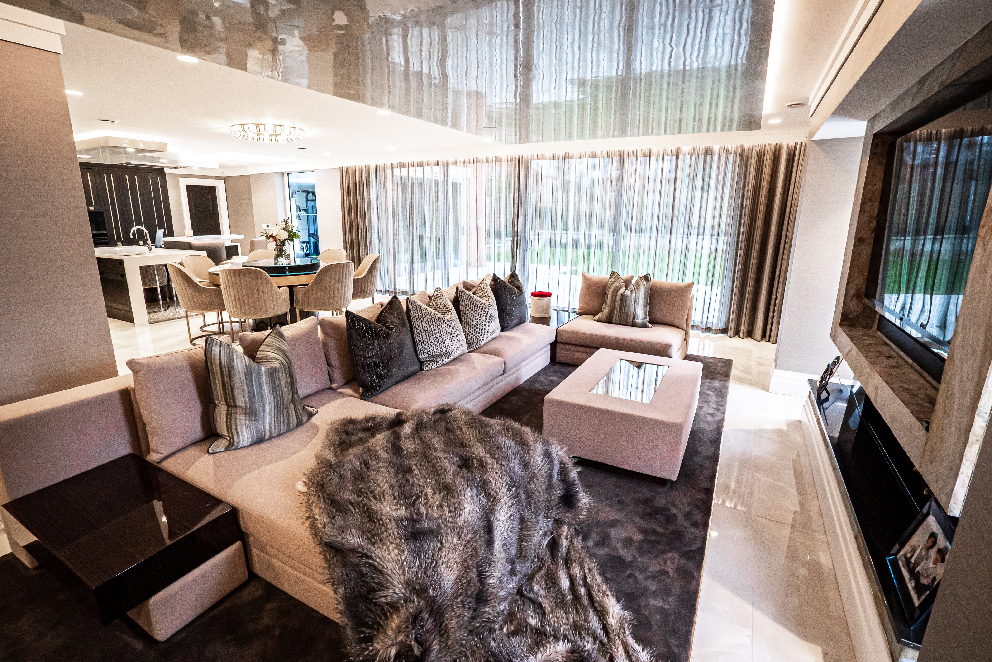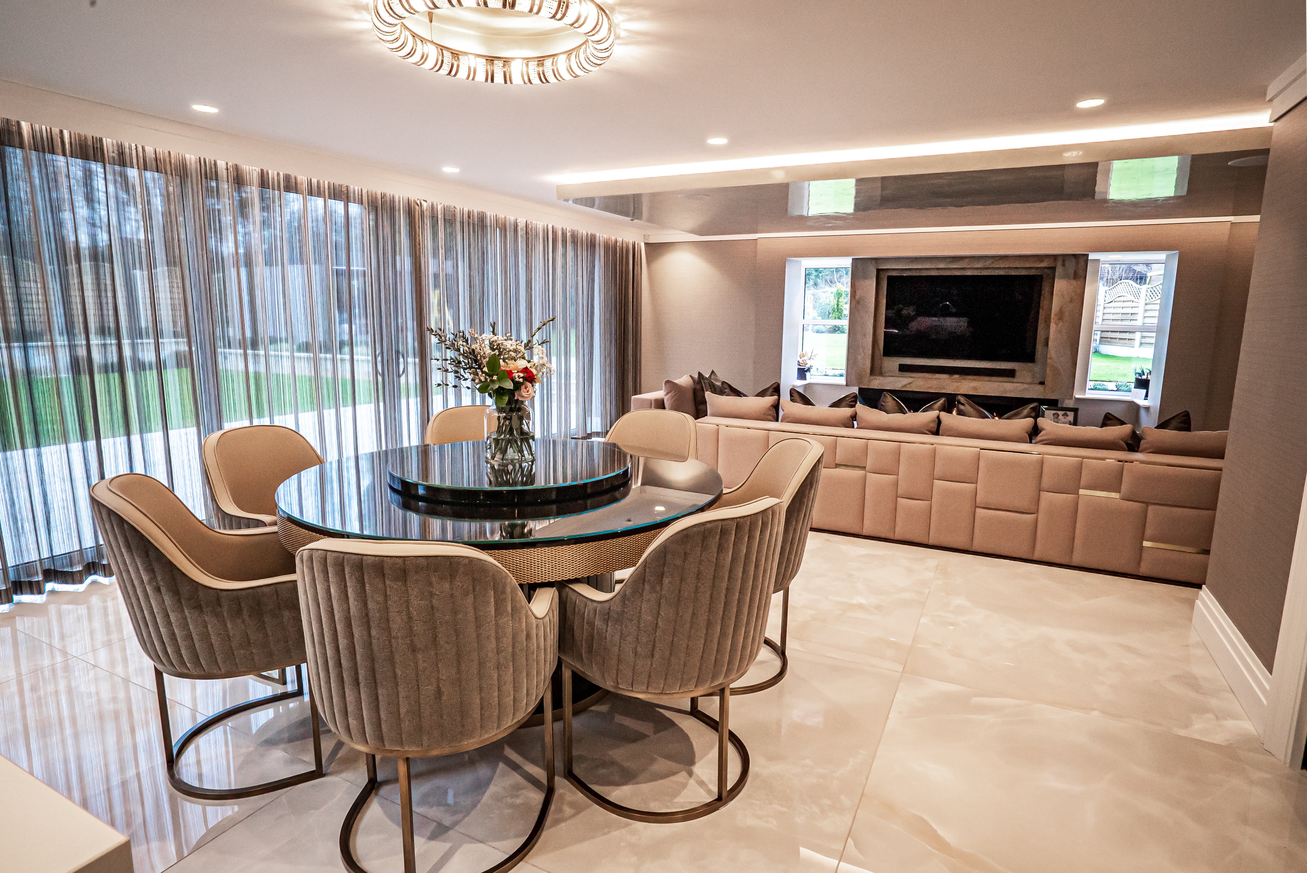 This open-plan living space exemplifies refined contemporary luxury, where rich textures, sculptural forms, and understated elegance come together seamlessly. The bespoke kitchen, framed in deep cabinetry with brass inlay detailing, anchors the space with quiet confidence, while the circular dining area creates a soft, sociable focal point. Full-height sheer drapery floods the room with natural light, adding fluidity and warmth. Every element has been curated for both aesthetic harmony and everyday comfort.