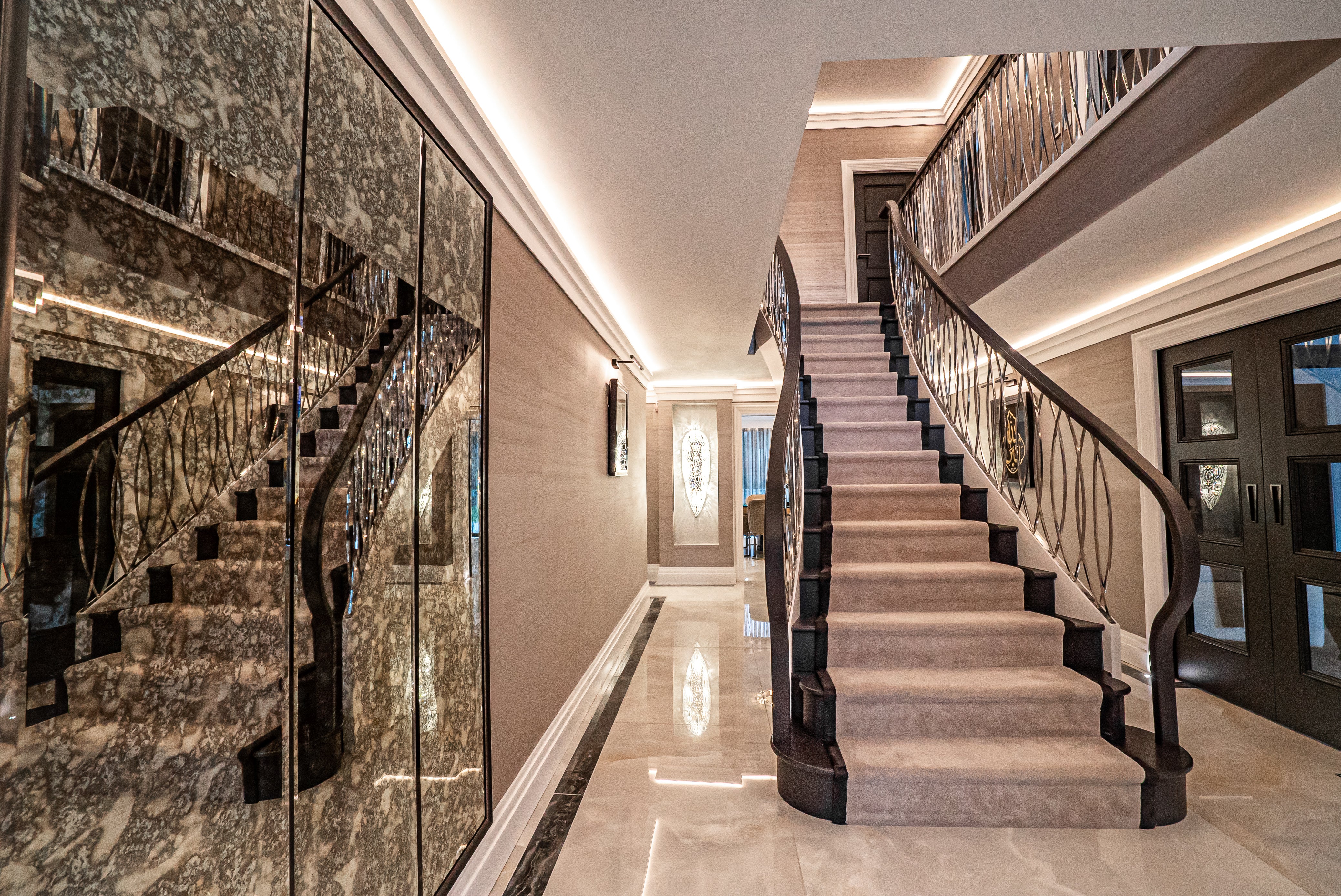 We were involved in this exceptional high-end residence from the architectural stage, allowing us to shape every interior detail with a level of sophistication and craftsmanship that mirrors the home’s architecture. At its core is a grand entrance hall, anchored by a sweeping statement staircase that sets the tone for the entire property.